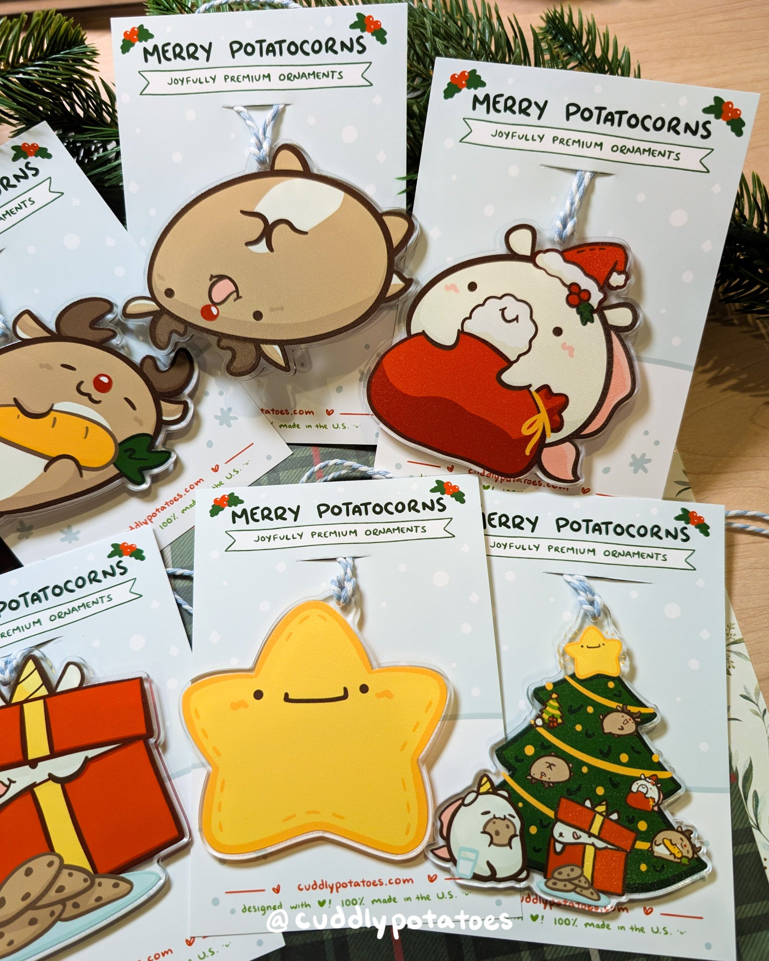 These cuddly holiday-themed ornaments are premium, high koality friends, sure to stand up to everyday use. Featuring potato-y reindeer, a santa potatocorn (potato-shaped unicorn), a cookie-eating potatocorn, a present potatocorn, a christmas tree, and a star. They are double-sided, sturdy, and scratch-resistant with a lovely matte shimmer coating on top. Colors may vary due to each computer monitor. Made with certified organic hugs.